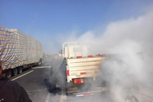 事情发生在11月9日上午,53岁的张宪良和董亚开着私家车,正赶往黄岛看望朋友。当车辆行驶至距离莒县服务区还有6公里处时,他们看到前方路面突然升起滚滚浓烟。“老远就看见黑烟冲天,走近了才发现是一辆小货车在着火,火焰都蹿得很高了。”张宪良回忆道,当时货车的轮胎、车厢里的棉衣棉被都在燃烧,引擎盖下方更是火光四射,隐约能看到油箱的位置,情况十分危急。